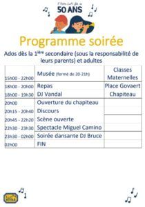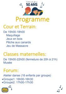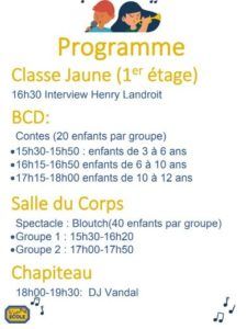 Ne manquez surtout pas l’interview d’Henry Landroit et les témoignages de quelques parents et anciens élèves à 16h30, dans la classe jaune. Le programme est la signalisation vous permettront de profiter au maximum de cette journée.
